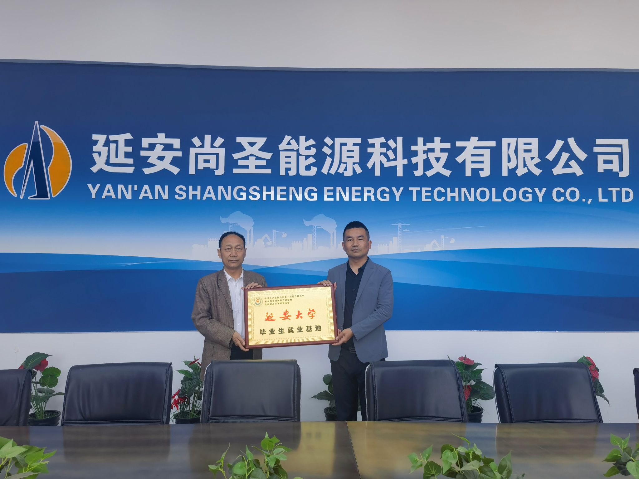 在延安尚圣能源科技有限公司,参观了企业实验室及生产厂区,与企业员工亲切交流。在交流座谈会上,公司总经理马广锋介绍了企业建设发展、生产经营情况。牛保明介绍了石油学院专业建设、师资队伍、人才培养、就业工作情况。随后,双方就发展规划、技术推广、科技创新、教学科研、就业实习等方面进行了深入探讨。在与会人员的共同见证下,牛保明与马广锋共同为“毕业生就业基地”揭牌。
