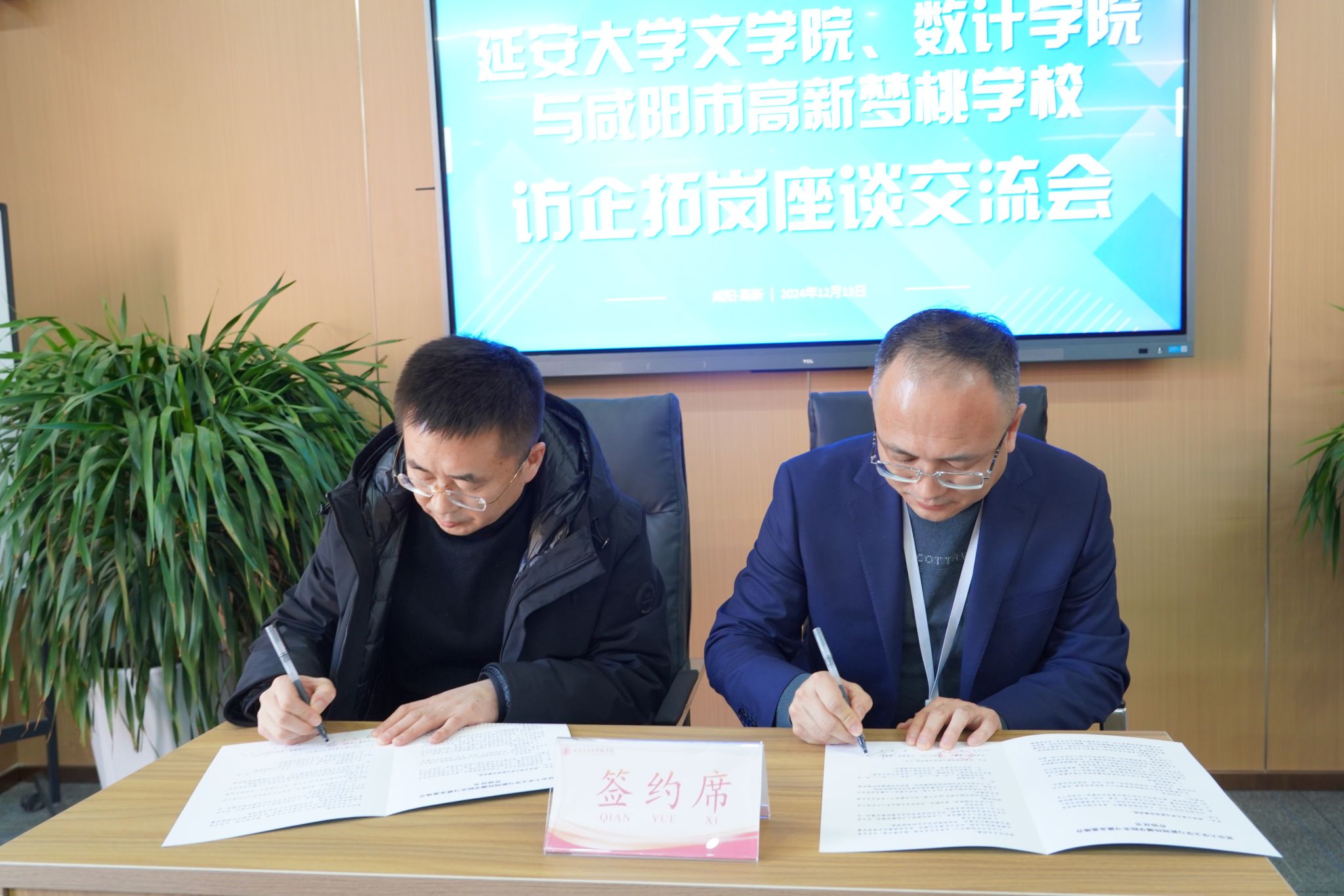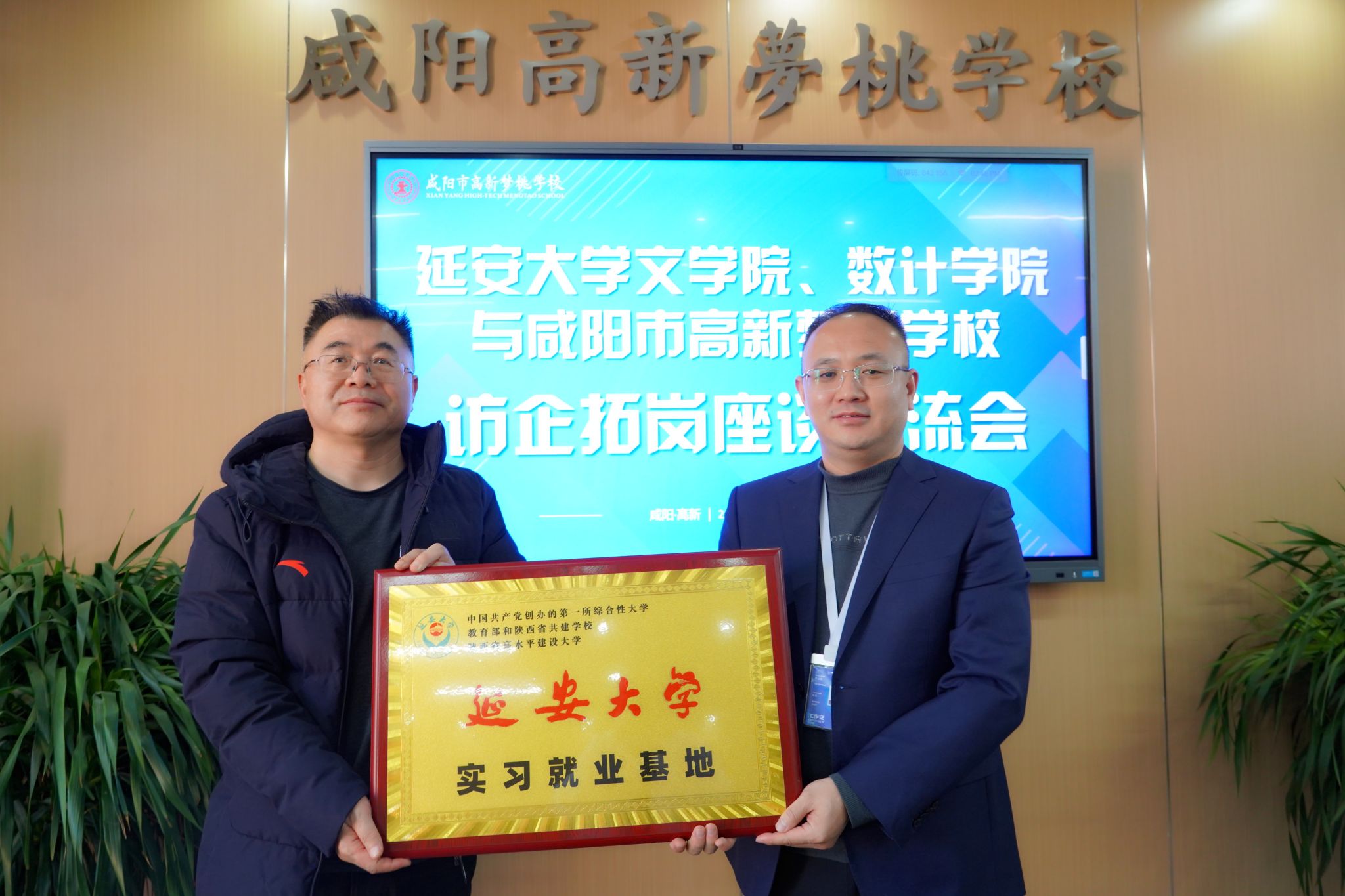 在咸阳市高新梦桃学校,双方进行座谈并签署了共建协议,该校校长李益民、副校长王静等校领导出席了活动。双方就各自学校的基本情况、办学特色、育人理念、人才培养等情况进行了深入交流,并就进一步加深实习就业基地建设、产教融合、师资培训、人才招聘、教学科研等方面达成了共识。学院党委书记姬小龙代表学院与咸阳市高新梦桃学校校长李益民签订了共建协议,学院院长党子奇向学校授牌并赠送《平凡的世界》和《路遥传》。