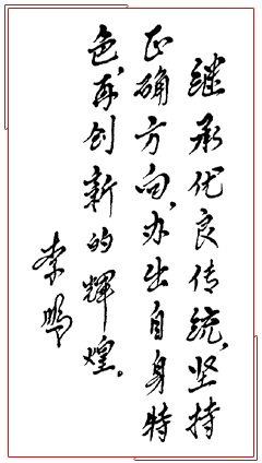 1997年10月16日,时任全国人大常委会委员长的李鹏同志,又一次挥毫为母校题词:继承优良传统,坚持正确方向,办出自身特色,再创新的辉煌。对学校的建设和发展提出了新的要求和更高的目标。