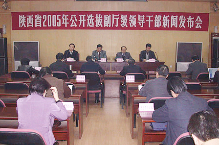 作者:佘占宏 稿源:两办 发稿日期:2005年11月22日 新闻发布会现场(转自陕西政府公众信息网) 11月21日下午,省委组织部召开2005年公开选拔副厅级领导干部新闻发布会,省委副书记、省纪委书记董雷、省委组织部副部长王绪刚、省委常委、省委组织部部长杨士秋等领导同志出席会议。