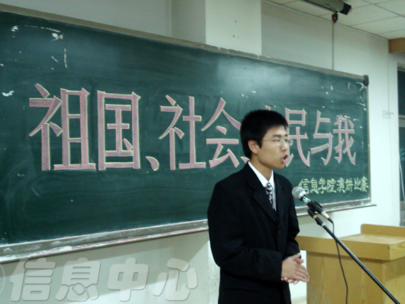 供稿:信息学院 发稿日期:2006-11-7 11月4日晚7点,信息学院在731教室举行了“祖国、社会、人民与我”主题演讲比赛初赛,本次比赛由我院四个本科专业的21名参赛选手参加,他们风格独特、尽展风采,以优雅风趣的语言艺术博得阵阵雷鸣般的掌声,最终冯苗苗、阎超、张瑞、唐鹏等十名选手以优异的表现脱颖而出,晋级复赛。