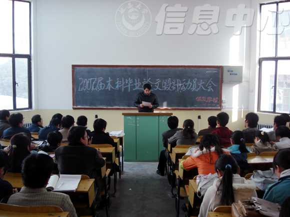 供稿:信息学院 发稿日期:2006-12-27 本网讯 12月23日下午,信息学院在第四阶梯教室召开了2007届本科毕业论文(设计)动员大会,院毕业论文(设计)工作领导小组全体成员和2007届毕业生参加了会议,大会由院毕业论文(设计)工作领导小组副组长张玉强副院长主持。