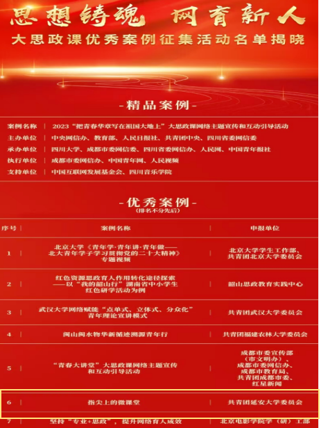 本网讯 近日,由中央网信办网络传播局、共青团中央宣传部指导,人民网、中国青年报社共同主办的“思想铸魂 网育新人”大思政课优秀案例征集活动评选结果揭晓,评选产生精品案例1件、优秀案例50件(陕西省3件)。beat365报送的工作案例《指尖上的微课堂》成功入选优秀案例。