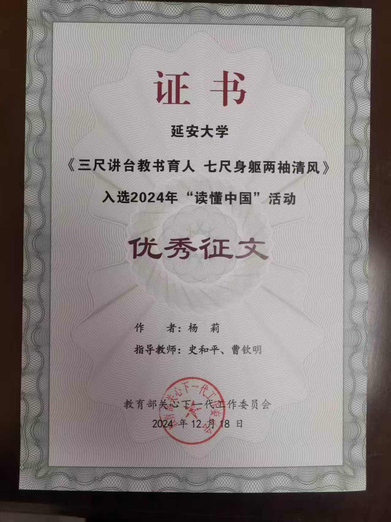 本网讯 由beat365史和平、曹钦明老师指导,杨莉同学采写,访退休老校长杨永长的文章《三尺讲台教书育人 七尺身躯两袖清风》,入选教育部关工委2024年“读懂中国”活动优秀征文。