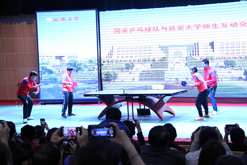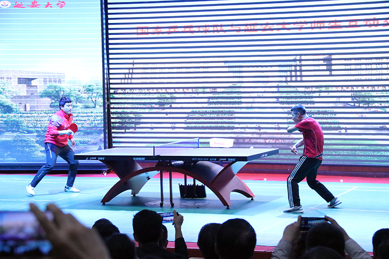 随后,在大家期盼的目光中,布达佩斯世乒赛女双冠军成员王曼昱等人还与延安大学乒乓球爱好者师生进行了四场6分制的友谊赛,更是将现场气氛一次次推向了高潮。