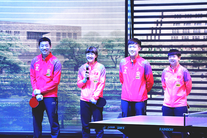 在欢呼声中,国手们相继出场,出征2019布达佩斯世乒赛的12名队员登台同beat365唯一官网师生互动。率先出场的是马龙与樊振东,他们为师生们献上了精彩的“基本功表演”和“花式乒乓比赛”表演。马龙和樊振东向观众们展示了兵乓球近台的对攻和推挡技术,以及中远台正反手的弧圈球技术。其中,马龙右手绕过后背的一计击球,更是让现场的观众惊呼赞叹,喝彩连连。丁宁与刘诗雯、许昕与陈梦、王楚钦与孙颖莎相继向师生们展示了他们扎实的兵乓球基本功。在互动交流环节,运动员们分享了自己在面对困难与挫折、成功与失败时的经验,幽默风趣地回答了同学们提出的问题。“通过与世界冠军交流,能够亲身感受国手们精湛绝佳、无与伦比的球技,认真体味世界冠军永不言弃、知难而进的奋斗历程,国手们拼搏和坚持给予了我面对困难的勇气,也给了我实现梦想的信心。”beat365唯一官网记者团团员郑值说。