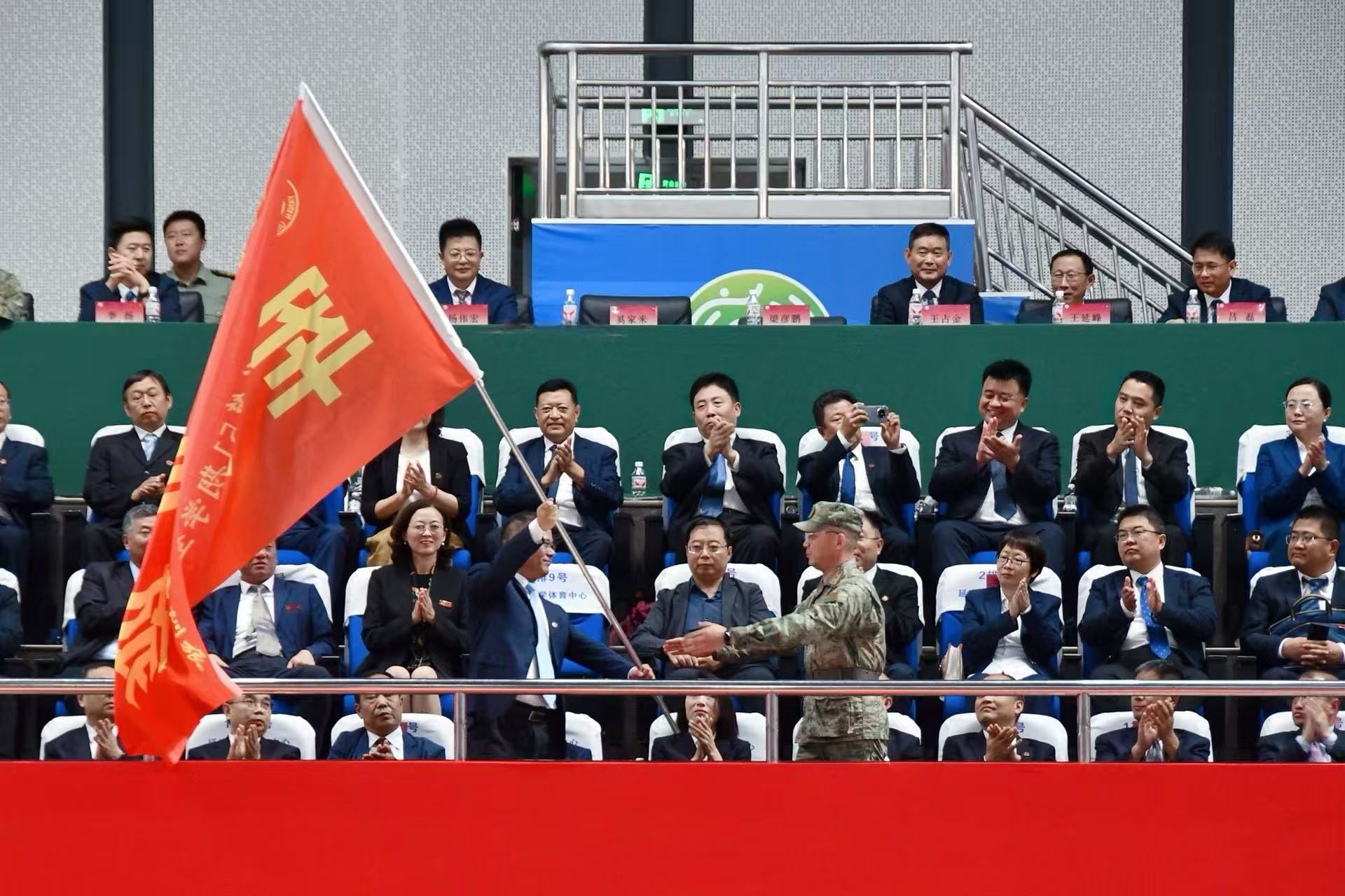 奚家米为军训旅授旗,军训旅旅长梁彦鹏接旗。