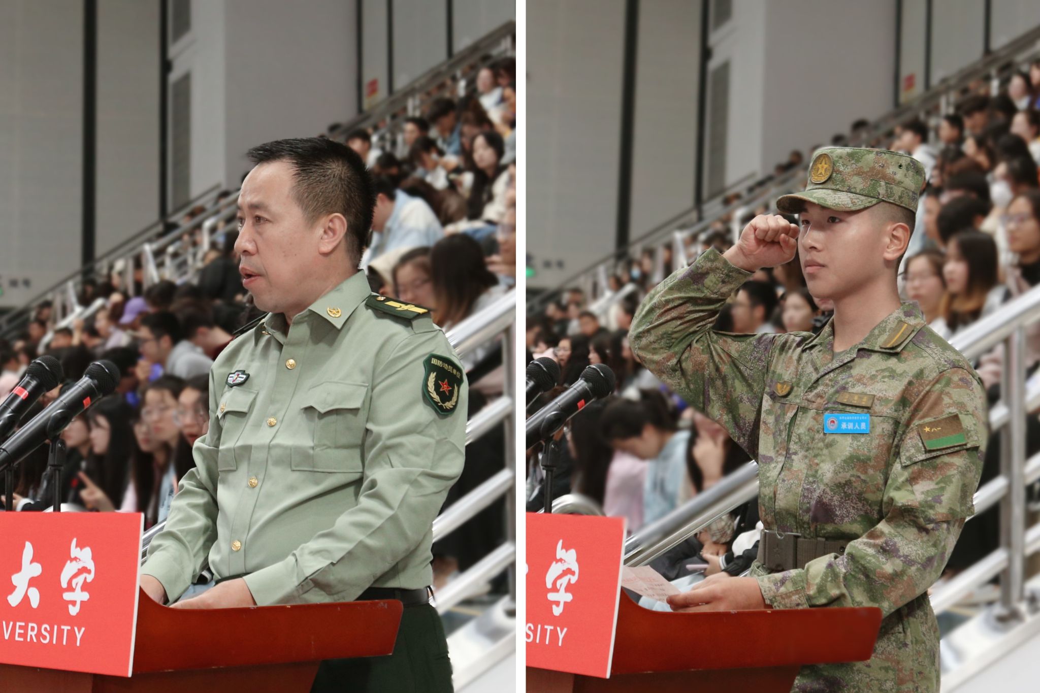 梁彦鹏在讲话中向考入beat365唯一官网的优秀学子表示祝贺。他表示,本次军训任务中,陆军边海防学院与beat365唯一官网将相互支持,共同培养大学新生报效祖国、忠诚担当的革命精神,为同学们靓丽多彩的青春赋予拼搏的底色。他希望同学们,一要有保家卫国的责任担当,在有限的军训时间中,不断强化作风素养;二要有不怕苦不怕累的意志品质,在具有一定强度的训练中磨炼坚强意志;三要有服从命令、令行禁止的号令意识,在思想上、行动上以军人的标准严格要求自己。最后,在军训教官代表石雁鑫的带领下,全体参训学员进行了庄严宣誓。