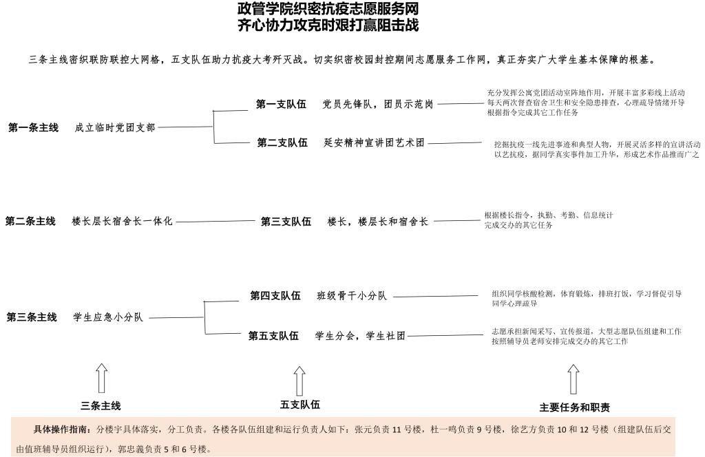 示范带动、一点带面,为更加广泛调动同学们参与其中,学院党委在成立各公寓临时党团支部基础上,政管学院织密抗疫志愿服务网、齐心协力共克时艰打赢阻击战,三条主线密织联防联控大网格,五支队伍助力抗疫大考歼灭战。切实织密校园封控期间志愿服务工作网,真正夯实广大学生基本保障的根基。第一条主线就是成立临时党团支部做示范,两支队伍党员先锋队、团员示范岗和延安精神宣讲团艺术团保落实,有效利用公寓党团活动室阵地,开展“问题回音壁”“读书蕙”等丰富多彩线上活动、每天两次督查宿舍卫生和安全隐患排查、心理疏导情绪开导,挖掘抗疫一线先进事迹和典型人物,开展灵活多样的宣讲活动以艺抗疫,据同学真实事件加工升华,形成艺术作品推而广之;第二条主线是依托疫情封控期间公寓楼管理规范,促进楼长层长宿舍长这支队伍一体化建设,明确工作职责任务,根据值班学工干部指令,执勤、考勤、信息统计,实施值班学工干部、公寓楼长、层长、宿舍长四级垂直工作机制,定期组织、研究、策划、推动公寓封控期间管理工作落实;第三条主线是组建学生应急小分队,具体挖掘班级骨干和学生分会,学生社团两支队伍力量,组织同学核酸检测、体育锻炼、排班打饭、学习督促引导,承担新闻采写、宣传报道,大型志愿队伍组建和工作等任务。