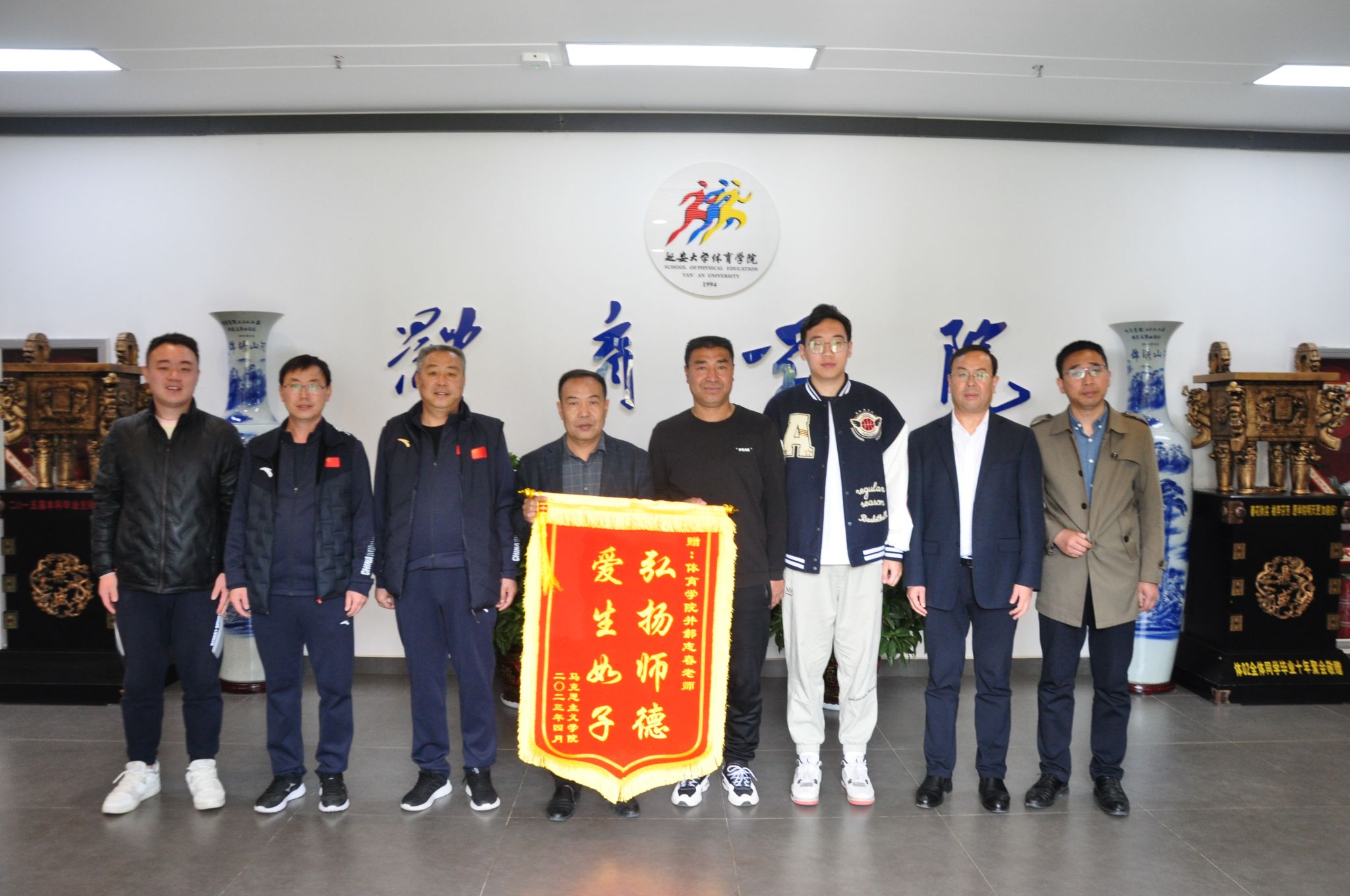 兰鸿涛代表学院对马克思主义学院专程前来为学院优秀教师郝志春的善举赠送锦旗,以及长期以来对体育学院各项工作的支持表示感谢。他说,郝志春老师作为学院民主党派教师,平时为人师表,师德师风高尚,教学能力强,学生认可度高。在本次运动会上挺身而出、果断救人,守护学生生命健康安全,彰显了他潜心教书育人、爱生如子的教师职业素养。在开展学习贯彻习近平新时代中国特色社会主义思想主题教育之际,必将在师生群体中起到良好的示范带头作用,激励广大教师进一步坚定理想信念,涵养高尚师德,坚守为党育人、为国育才的责任和使命。