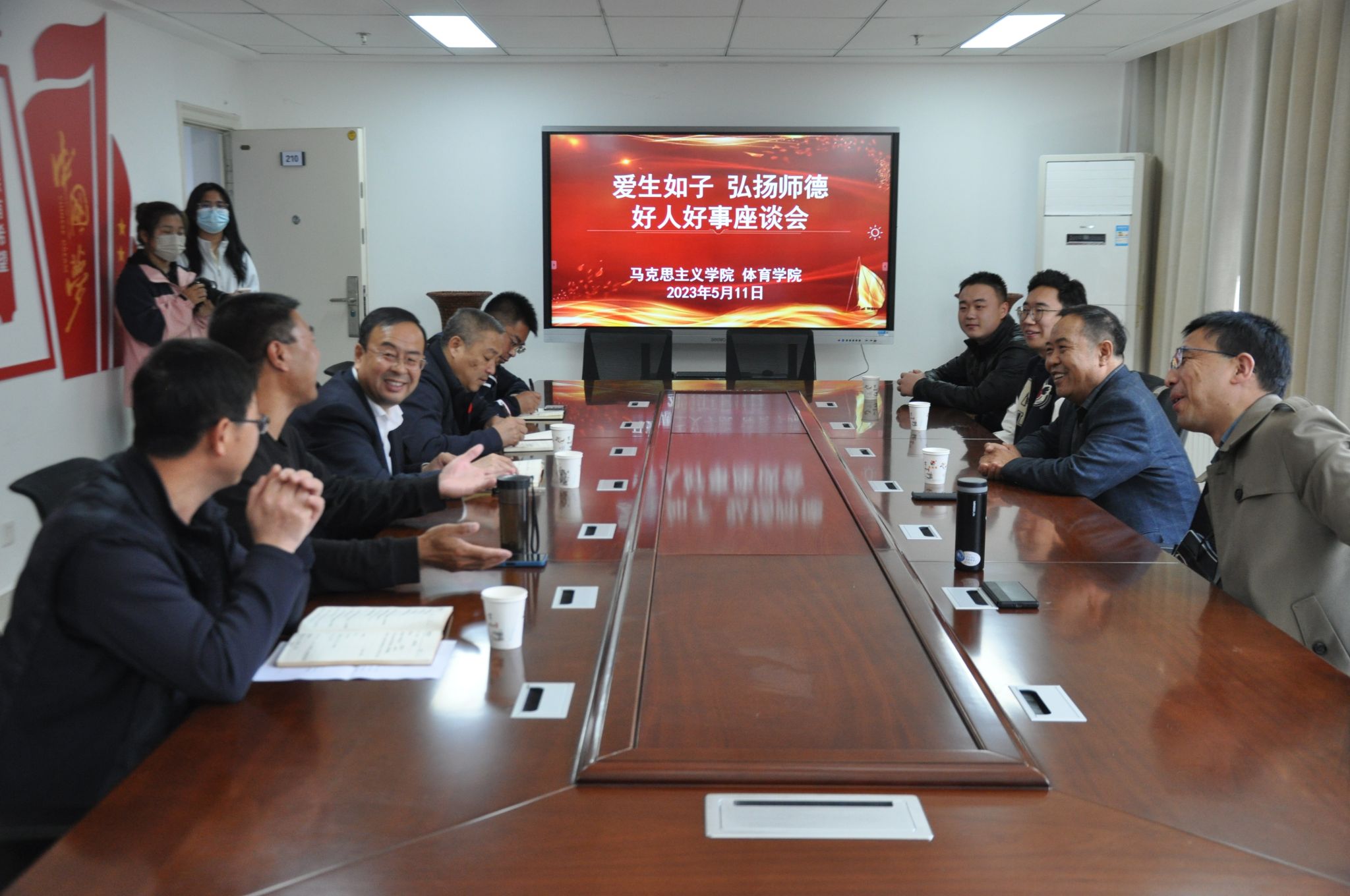 本网讯 为进一步弘扬好人好事,传递师德师风建设正能量,突出宣传新时代体育教师教师爱岗敬业、爱生如子、乐于奉献的师德风尚,5月11日上午,马克思主义学院、体育学院联合举行“爱生如子·弘扬师德”好人好事座谈会,马克思主义学院党委书记张彬、党委副书记赵海龙、思想政治教育专业玉章英才实验班2020级杨浩宇同学、班长陈明明同学,体育学院党委书记兰鸿涛、院长宗有智、教师郝志春参加了会议,会议由体育学院党委副书记徐海阔主持。