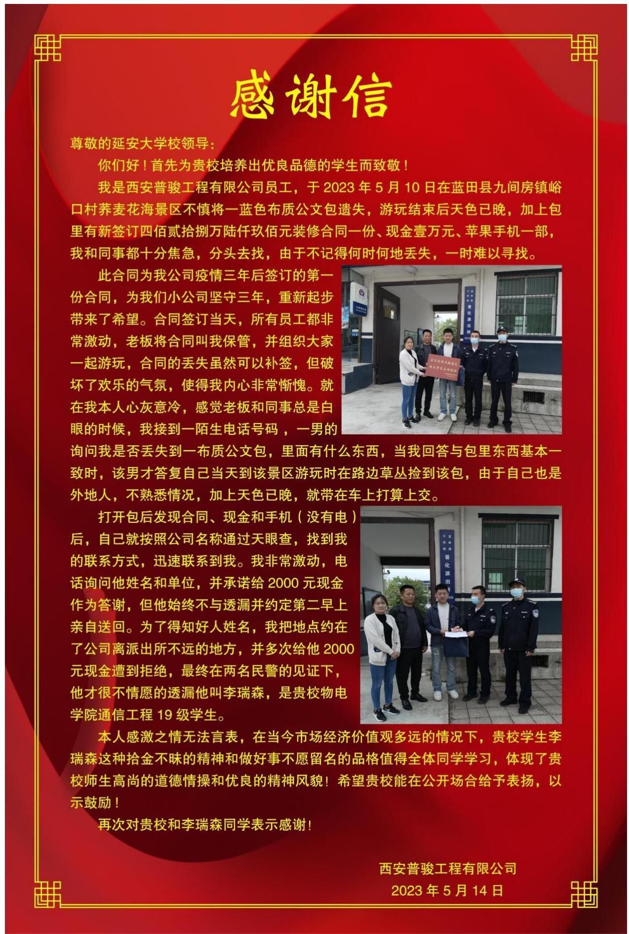 会上,全体起立奏唱中华人民共和国国歌。肖金学介绍了通信19班李瑞森同学“拾金不昧”先进事迹基本情况,宣读了学院表彰决定。张富春向李瑞森颁发了荣誉证书,常胜伟为李瑞森佩戴绶带。李瑞森在交流发言时说道:捡到东西要归失主是普通的一件小事,自己良好习惯的养成得益于优良家风中父母的言传身教,得益于母校老师的辛勤培育,特别是大学四年,在延安这片红色的沃土上,在beat365唯一官网这座红色熔炉中,延安精神对自己潜移默化地滋养。同学代表杨嘉成,辅导员冯晓依次作了交流发言。袁松岩老师代表学院宣读了向李瑞森同学学习的倡议书。