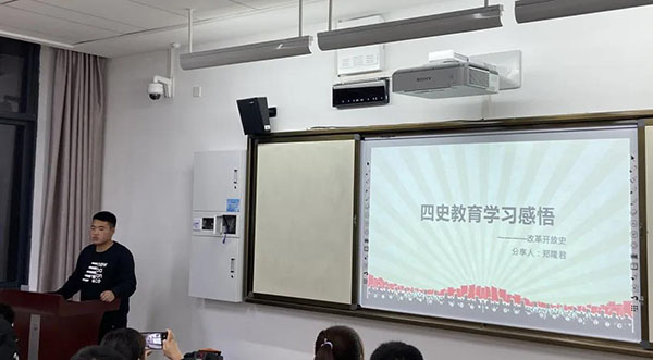学生党员代表杜鸿钿发言。他提到:“学习四史是进行自我净化,自我完善,自我革新,自我提高,学就要有收获,学就要有感触,把这种学习变为常态,每当遇到挫折时,就看看革命先烈们保家卫国,舍生忘死的爱国精神,学习前人艰苦奋斗的工作作风。生活在这个和平的年代里,我们不能忘记了历史,不能忘记了过去艰苦的生活。”新时代下,我们已经完成脱贫攻坚任务,全面建成小康社会,我们即将迎来第一个百年奋斗目标,我们要继续努力奋斗,向着新四个全面发起进攻,作为新时代青年,我们要有理想,有担当,有作为,最重要的是做好现阶段的任务,完成大学学业,扎实学习,勤加锻炼,继承发扬前人之志,为新时代建设社会主义现代化国家而努力奋斗。